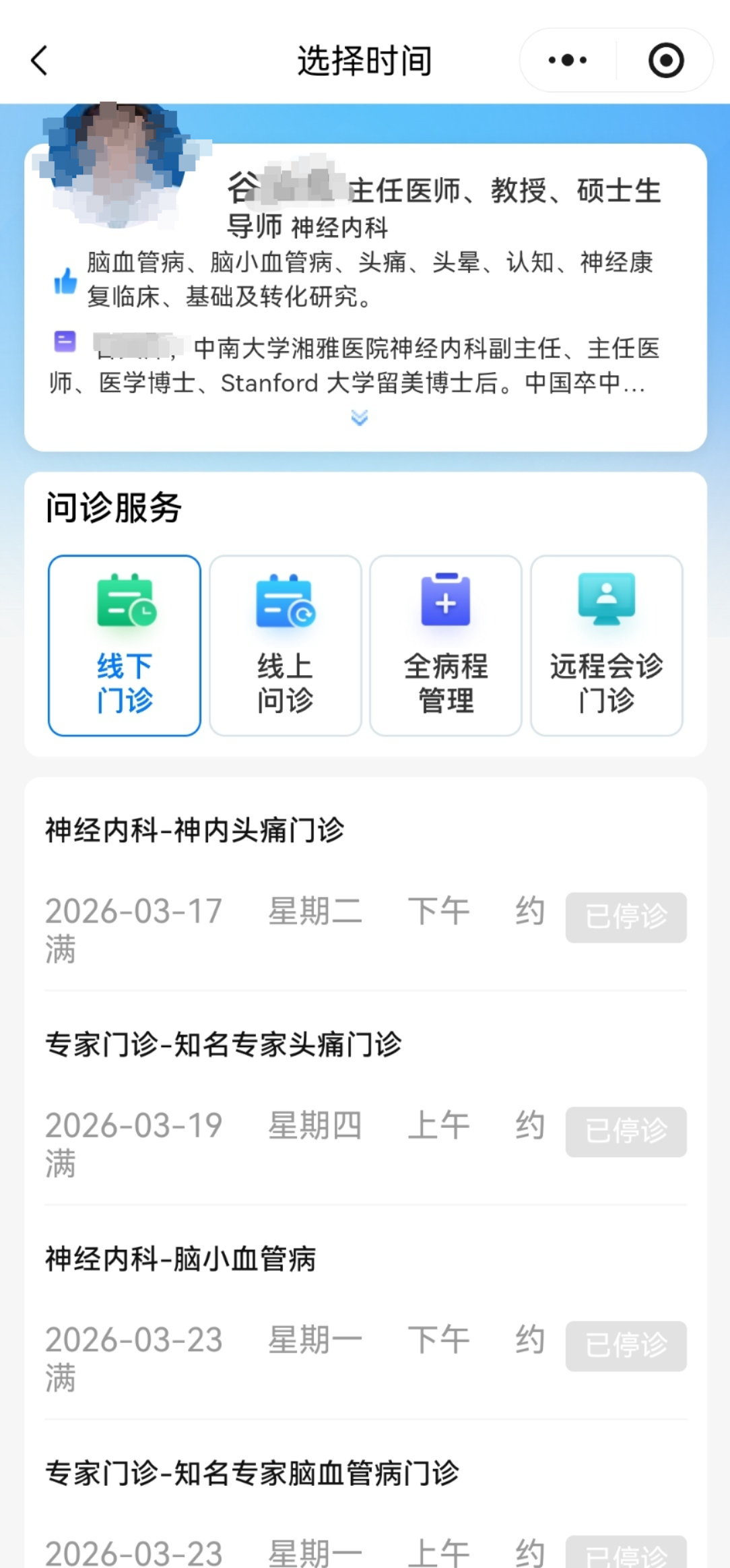 △中南大学湘雅病院小措施预约挂号系统贯通,UEDBET中国app官方手机版该院神经内科副主任、主任大夫谷某某当今处于停诊情状