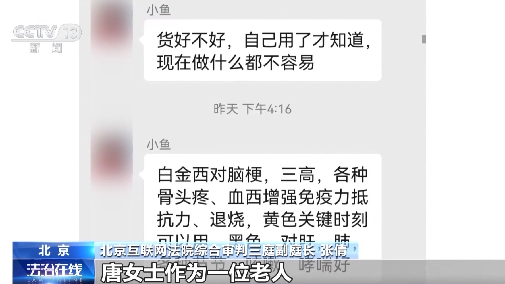 北京互联网法院笼统审判三庭副庭长 张倩:在微信群中有自称店铺的责任主说念主员,宣传唐女士购买的这些商品的疗效,比如某某款商品具有防治癌症,某款商品具有诊治某种疾病等商品信息。唐女士行动一位老东说念主,自己也对我方的自身健康尽头善良,于是她就对这些客服东说念主职责任主说念主员的话投降不疑。