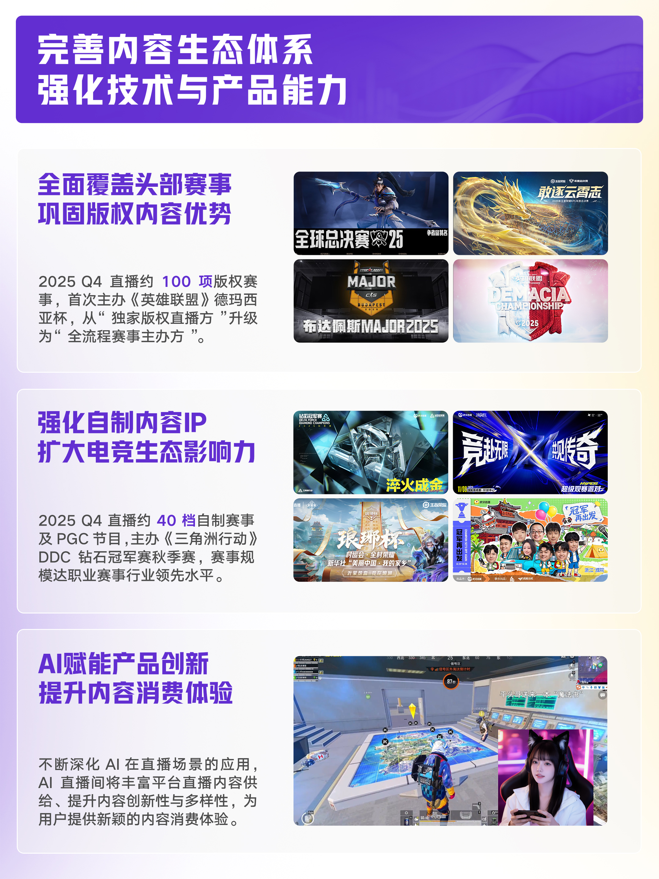 四季度,虎牙平台直播近100项版权赛事,并推出约40档好处赛事及PGC节目。12月,虎牙成为《好汉定约》中枢工作赛事——“德玛西亚杯”的专揽方。这是好汉定约官方初度将赛事专揽权授予第三方直播平台,象征着虎牙从过往“独家版权直播方”向“全经由赛事专揽方”进一步升级。