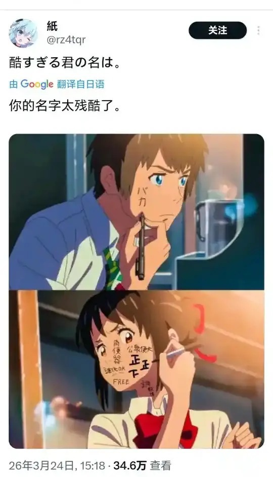 最近一位日本网友在玩《你的名字》里“脸上写字”的名时局,原来纯情到本体里的片断,被他们玩出了澈底不相似的画风,笑称——你的名字太摧毁了!